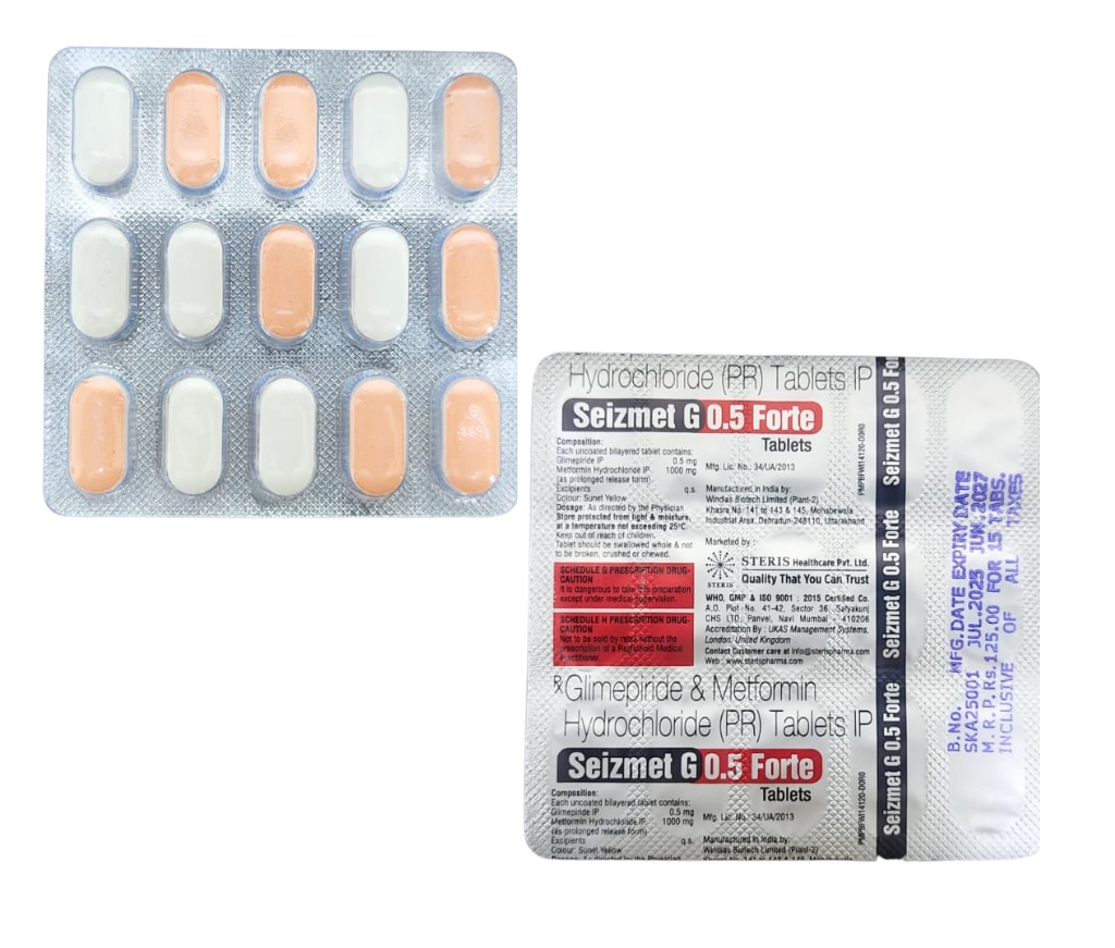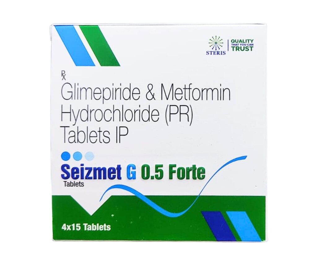 SEIZMET G0.5 FORTE is a powerful oral antidiabetic medication formulated with a combination of glimepiride and metformin hydrochloride. This dual-action therapy is specifically designed for patients with type 2 diabetes mellitus who are unable to control their blood sugar levels with diet and exercise alone. The combination works in synergy to manage blood glucose effectively, reduce insulin resistance, and improve overall glycemic control. Glimepiride and metformin hydrochloride tablets are a combination medication used to treat type 2 diabetes. They work by helping the pancreas release more insulin and by reducing the amount of sugar produced by the liver, while also making the body more sensitive to insulin. What is SEIZMET G0.5 FORTE? SEIZMET G0.5 FORTE contains two active ingredients: Glimepiride (0.5 mg): A sulfonylurea class drug that stimulates the beta cells of the pancreas to release insulin. Metformin Hydrochloride: A biguanide that works primarily by suppressing hepatic glucose production and increasing insulin sensitivity in muscles. Together, this combination addresses both insulin deficiency and resistance—two key factors in type 2 diabetes. Uses of SEIZMET G0.5 FORTE: Effective in managing type 2 diabetes mellitus Helps in reducing fasting and postprandial blood glucose levels Used as monotherapy or in combination with other antidiabetic agents Reduces the risk of diabetic complications such as nephropathy, retinopathy, and cardiovascular disease Side Effects of SEIZMET G0.5 FORTE: Like all medications, glimepiride and metformin hydrochloride tablets may cause side effects in some patients. Common side effects include: Nausea or vomiting Diarrhea Hypoglycemia (low blood sugar) Headache Dizziness Metallic taste in the mouth Abdominal discomfort In rare cases, it may cause lactic acidosis, a serious condition related to metformin accumulation. Precautions Before Using SEIZMET G0.5 FORTE: Always take the medication exactly as prescribed by your doctor. Inform your physician if you have a history of liver or kidney disorders, heart disease, or alcohol abuse. Avoid excessive alcohol consumption while on this medication as it increases the risk of lactic acidosis. Not recommended for patients with type 1 diabetes or diabetic ketoacidosis. Regularly monitor your blood sugar and kidney function. This medicine should be used during pregnancy only if absolutely necessary and under medical supervision. Drug Interactions: What Drugs Interact with SEIZMET G0.5 FORTE? Certain medications can interact with glimepiride and metformin, affecting their efficacy or increasing the risk of side effects. These include: Beta-blockers (e.g., propranolol) – may mask hypoglycemia symptoms Diuretics – may impair blood sugar control ACE inhibitors – may increase the blood glucose-lowering effect Corticosteroids – may reduce the effectiveness of the medication Antipsychotics (e.g., olanzapine) Alcohol – increases the risk of lactic acidosis Cimetidine – may raise metformin levels in the body Always inform your healthcare provider about all medications, supplements, or herbal products you are taking. Conclusion: SEIZMET G0.5 FORTE is a trusted, effective choice for managing type 2 diabetes, offering the combined benefits of glimepiride and metformin hydrochloride tablets. With dual mechanisms—enhancing insulin secretion and improving insulin sensitivity—it delivers comprehensive glycemic control. When taken as directed and with regular monitoring, SEIZMET G0.5 FORTE can be a valuable part of a diabetic patient’s treatment regimen, contributing to a healthier, more balanced life. For best results, pair this medication with a proper diet, regular physical activity, and periodic blood glucose testing. Always consult your healthcare provider for personalized advice.