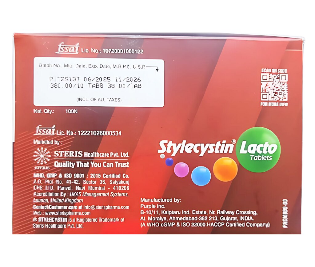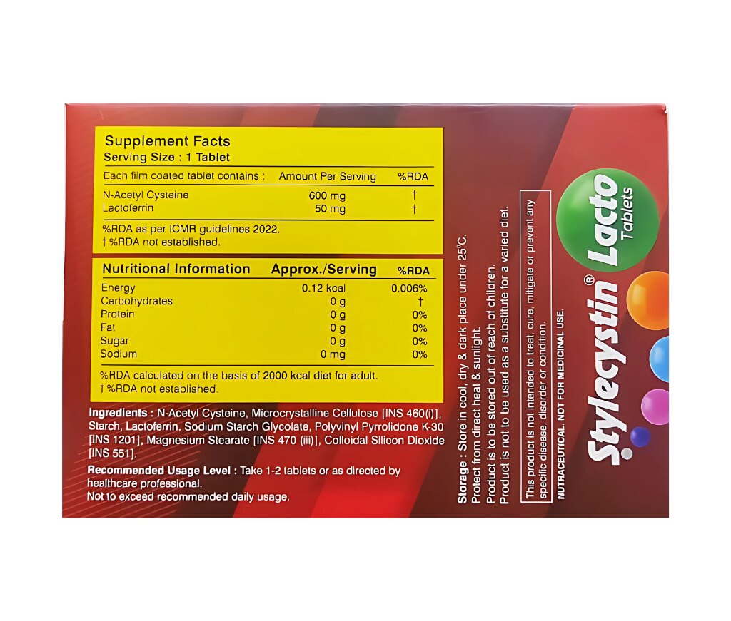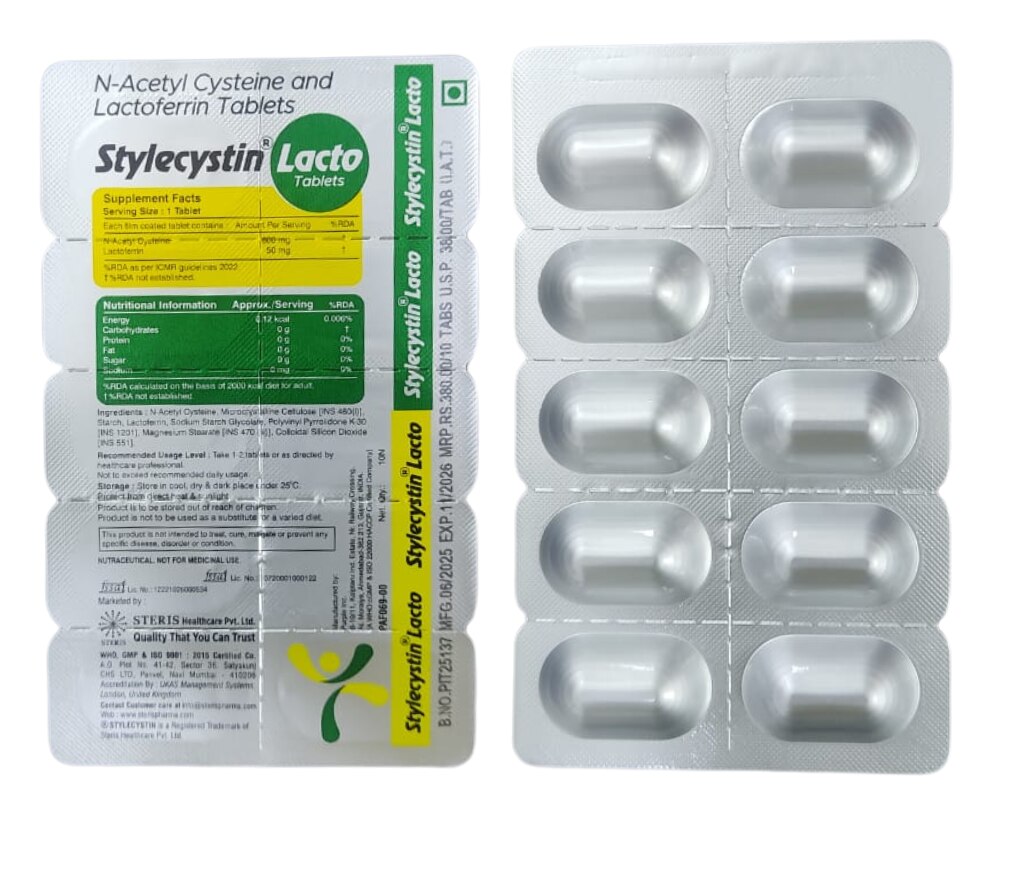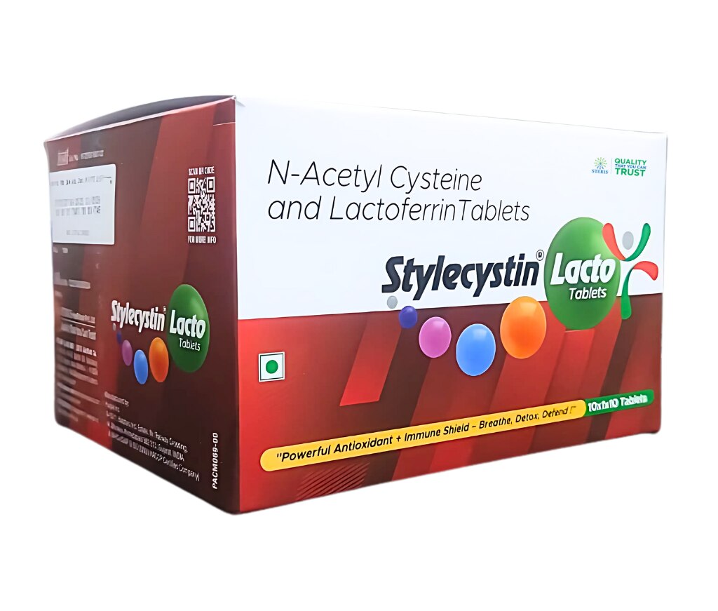 STYLECYSTIN LACTO combines two powerful, scientifically backed ingredients—N-Acetyl Cysteine (NAC) and Lactoferrin—to support respiratory health, immune function, and antioxidant protection. This dual-action tablet is designed for optimal bioavailability, delivering targeted support for individuals seeking relief from mucus congestion, enhanced immune defenses, and overall cellular wellness. What Is STYLECYSTIN LACTO? STYLECYSTIN LACTO is a synergistic supplement featuring: N-Acetyl Cysteine (NAC) (600 mg): A precursor to the antioxidant glutathione, NAC helps thin and loosen mucus in the airways while neutralizing free radicals. Lactoferrin (100 mg): A naturally occurring glycoprotein with antimicrobial and immunomodulatory properties that supports iron homeostasis and strengthens innate immunity. Together, these n-acetyl cysteine and lactoferrin tablets offer comprehensive respiratory and immune support in one convenient dose. Uses of N-Acetyl Cysteine and Lactoferrin Tablets Mucolytic Therapy NAC breaks down disulfide bonds in mucus, promoting easier expectoration in conditions like chronic bronchitis, COPD, and sinusitis. Antioxidant Support NAC boosts glutathione synthesis, scavenging free radicals and protecting cells from oxidative stress. Immune Enhancement Lactoferrin modulates immune cell function, inhibits pathogen growth by sequestering iron, and supports a balanced inflammatory response. Upper Respiratory Health Combined action helps reduce the frequency and severity of viral and bacterial respiratory tract infections. Gut–Immune Axis Support Lactoferrin promotes a healthy gut microbiome, supporting digestive wellness and systemic immunity. Side Effects of STYLECYSTIN LACTO While n-acetyl cysteine and lactoferrin tablets are generally well tolerated, some individuals may experience: Gastrointestinal Discomfort: Nausea, bloating, or loose stools (usually mild and transient) Allergic Reactions: Rare skin rash, itching, or hives—more likely in those with milk protein sensitivities (due to lactoferrin) Headache or Dizziness: Occasional, typically improves with continued use Unpleasant Odor: NAC may produce a mild sulfur-like taste or smell If side effects persist or worsen, discontinue use and consult your healthcare provider. Precautions Before Using STYLECYSTIN LACTO Before starting STYLECYSTIN LACTO, consider the following: Allergy Alert: Do not use if you have a known allergy to N-Acetyl Cysteine, lactoferrin, or milk-derived proteins. Asthma & Bronchospasm: Use cautiously in patients with asthma, as NAC’s mucolytic effect may trigger bronchospasm in sensitive individuals. Peptic Ulcer Disease: NAC can irritate the gastrointestinal mucosa; avoid or monitor closely if you have active ulcers. Pregnancy & Breastfeeding: Safety in pregnant or lactating women has not been fully established—consult your doctor. Dosage Compliance: Adhere strictly to the recommended dose; do not exceed without medical supervision. Drug Interactions: What Drugs Interact with STYLECYSTIN LACTO? Nitroglycerin & Other Vasodilators Co-administration with NAC may increase the risk of hypotension or headaches. Activated Charcoal May bind NAC in the gut, reducing its absorption and efficacy. Antibiotics (e.g., Tetracyclines, Quinolones) Lactoferrin’s iron-sequestering action could reduce antibiotic bioavailability; take antibiotics at least 2 hours apart. Anticoagulants (Warfarin) NAC may potentiate anticoagulant effects; monitor INR levels closely. Chemotherapeutic Agents High-dose antioxidants like NAC could, in theory, interfere with oxidative mechanisms of certain chemotherapies—use only under oncology guidance. Always inform your healthcare provider about all prescription drugs, over-the-counter medications, and supplements you are taking to minimize the risk of adverse interactions.